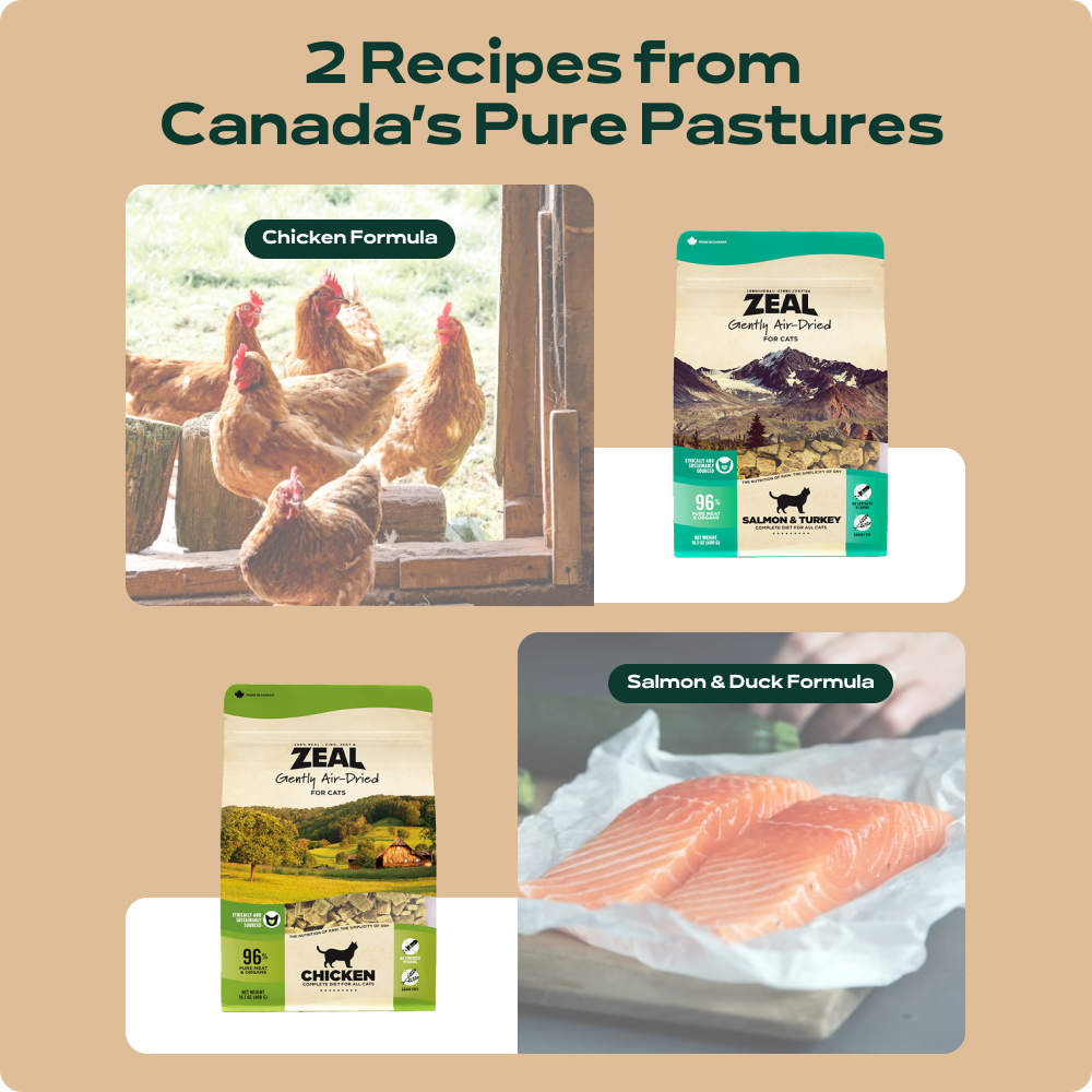 ZEAL cat food recipes reflect the natural diet of your feline, combining ethically sourced meats with minimal processing to lock in essential nutrients and irresistible flavor. Offering both Canada air-dried and New Zealand wet formulas, ZEAL provides superior nutrition and taste your cat will love.